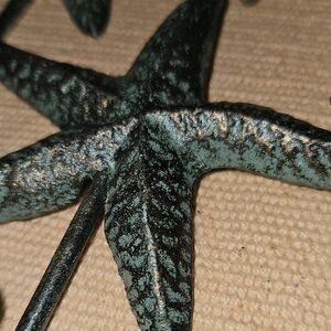 These starfish-shaped hooks, with their verdigris green patina, add a coastal charm to your wall decor. Perfect for hanging items, they bring a touch of the ocean to your home. The detailed design mimics natural starfish patterns, enhancing their nautical appeal. 3"x3" set of four total
