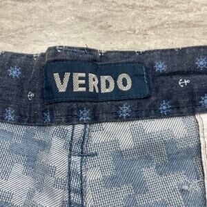 Verdo Men's Chino Pants in size 40, regular fit. These blue chinos feature a geometric pattern and are made from a breathable blend of linen and cotton. Designed for casual occasions, they include belt loops, two front pockets, and two back pockets. The pants have a flat front with a button closure and are machine washable. Suitable for casual outings and relaxed gatherings. Pre-owned.