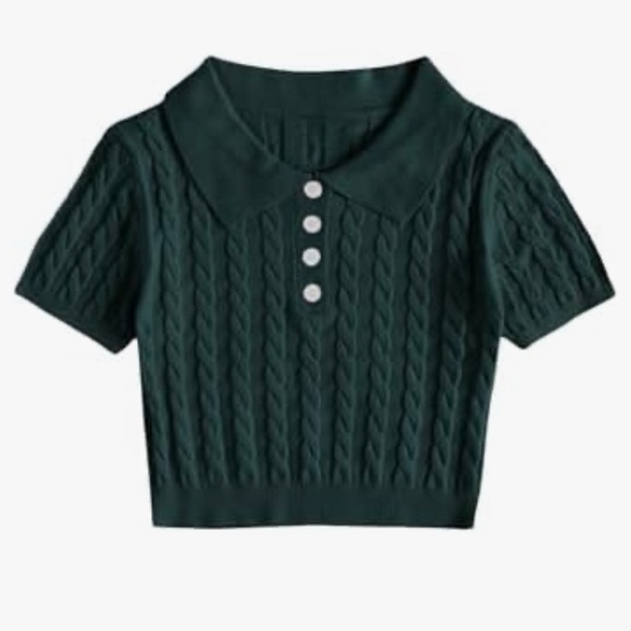 Verdusa Women's Button Front Short Sleeve Cable Knit Crop Top Dark Green XSmall