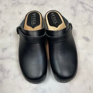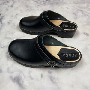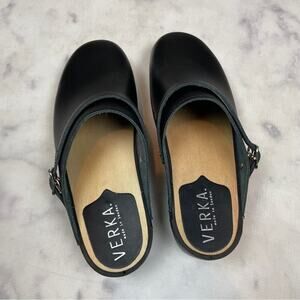 black leather professional comfort clogs from Verka. adjustable functional strap that can be worn two different ways. approx 2” heel with .75” platform. wood inlay insole with synthetic sole. made in Sweden. EUC - like new - worn only once.