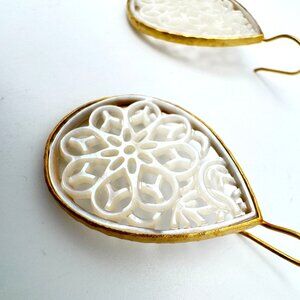 These teardrop earrings feature a stunning filigree design with mother-of-pearl inlay, set in Vermeil gold plated sterling silver. Their elegant design is ideal for those seeking a sophisticated accessory to complement evening wear or formal attire. Crafted with precision, these earrings blend contemporary style with timeless charm.