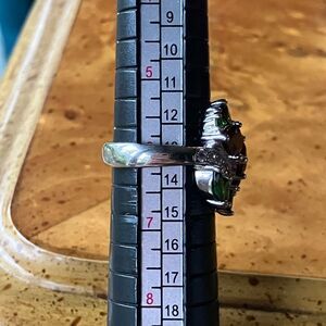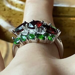 This gorgeous ring features all genuine, earth mined gemstones. The stones in this ring include red garnet, chrome diopside, and white zircon. Zircons are earth mined gemstones. They are not the same as cubic zirconia, which are man-made. The total gemstone carat weight on the ring is 4.07. The ring is set in solid .925 sterling silver with a rhodium plate to prevent tarnishing. Size 6.