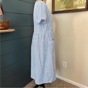 This elegant blue striped dress features a classic button-down design. Perfect for any occasion, it offers a comfortable fit with short sleeves and convenient pockets. Adorable cottagecore style!