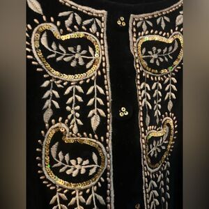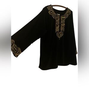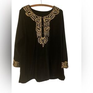 Gorgeous velvet and gold tunic by Vermont Country Store. Dark black. Excellent condition. Gold embroidery and subtle sparkling sequins.