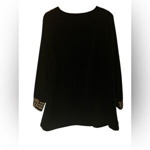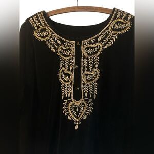 Gorgeous velvet and gold tunic by Vermont Country Store. Dark black. Excellent condition. Gold embroidery and subtle sparkling sequins.