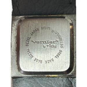 This Vernier women’s quartz wristwatch blends timeless design with a bold, vintage-inspired cuff style. The square stainless steel bezel frames a classic white dial with raised gold-tone hour markers at 12, 3, 6, and 9, complemented by minimalist tick marks for the other hours. The wide brown leather cuff band features an embossed tooled floral pattern, adding a rustic, artisan touch to the piece. The open cuff design ensures comfortable wear with an easy slip-on fit, shown here on a 6.5" display but adjustable for nearby wrist sizes. The case back is marked “Vernier by 70’s, Japan Movt, Stainless Steel Back, Base Metal Bezel,” indicating reliable Japanese quartz movement.