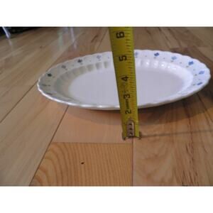 This beautiful oval serving platter by Metlox is a true vintage piece from 1978, featuring the stunning hand painted True Blue pattern with baby blue flowers on a glossy white background. The platter is 13 1/2" in diameter, with a height of 3/4" and a width of 10 1/4". It is made of high-quality ceramic material and is decorated with stackable and decorative features, making it a perfect addition to your Mid-Century Modern style. The platter has one compartment and can be easily hand washed. It weighs 2 lbs and has the backstamp of Vernon Ware by Metlox, Made in California. This platter is a part of the Vernon Ware product line and is a great choice for serving your favorite dishes. This platter is in EXCELLENT Condition!!!