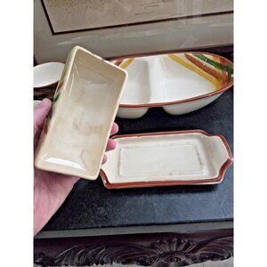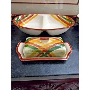 Condition: Overall good vintage condition. No major chips or cracks; light age wear consistent with use. Glaze variations and brushstroke differences are intentional and part of Vernonware’s handmade appeal. Butter dish has a small chip on the underside of the base plate.