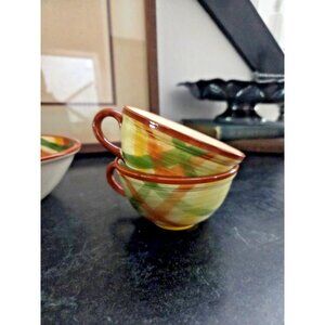 This vintage Vernonware Homespun set captures the charm of mid-century California pottery. Produced by Vernon Kilns during the 1940s–1950s, the Homespun pattern features a hand-painted plaid in rustic red-brown, green, and golden yellow. Each piece is painted under the glaze, meaning no two are exactly alike, and they carry the timeless charm of handcrafted dinnerware.