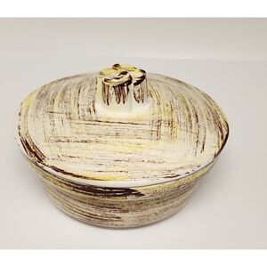 Mid-Century Modern Brown White Yellow Ceramic Serving Dish w Lid 7x4.5. This bowl is in good vintage pre-owned condition with no cracks, or chips, there is some crazing due to aging, but no visible scratches. There may be worn consistent with normal use as this is a preloved item. Please view photos carefully for condition. This item presents as it has not been used much.