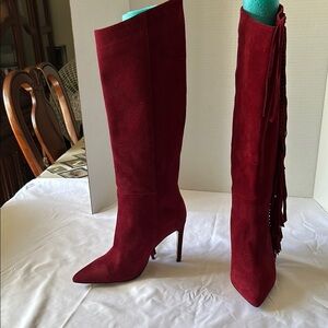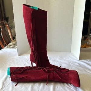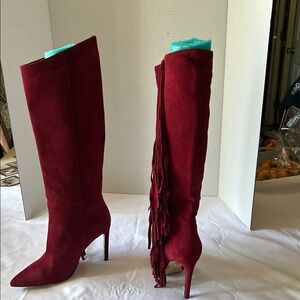 Step out in style with these Vero Cuoio over-the-knee boots, crafted in a striking red hue. The sleek silhouette and luxurious material make them a standout choice for any occasion. Elevate your wardrobe with these sophisticated boots that promise both elegance and comfort.