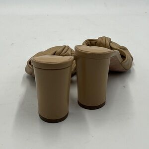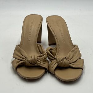 These elegant tan heels from Vero Cuoio feature a distinctive knotted design on the upper, crafted from a soft material for a luxurious touch. The medium-height chunky heel ensures comfort and stability, while the open toe and slip-on style offer a versatile look for various occasions.