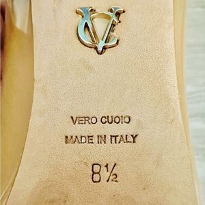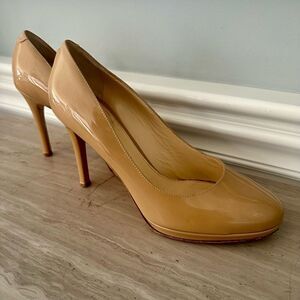 Stunning patten leather slip on pumps with 4” heels by Vero Cuoio, Vestiaire Collective. 1/4” platform. In a neutral, light tan color. Made in Italy. Excellent condition.