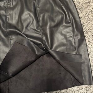 A sleek knee-length pencil skirt in luxurious faux black leather, featuring a high waistline and a straight cut down to the hem for a classic and sophisticated look. Back slit.