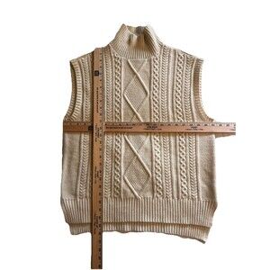 This is a Vero Moda Cable Knit Sweater Vest in Cream, featuring a Funnel Neck, Sleeveless style, and a Knit fabric in fisherman style made of Polyester, Nylon, and Acrylic. The size is Large, with a preppy, light academia and boho vibe, perfect for a college or classic 90s look.