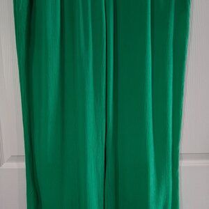 Vero Moda Curve women's bright green wide leg pants, new with tags, size 18, made from 100% Lenzing Ecovero for a sustainable, lightweight feel. Features a pull-on style with an elastic waist, crinkle texture, and two side pockets. Style VMMENNY. Measures approximately 38" waist, 14" front rise, 22" rear rise, 32" inseam, and 45" overall length.