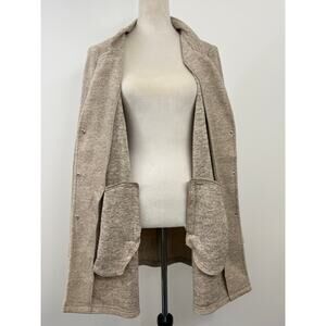 Vero Moda long heathered coat in a soft light brown/tan, women’s XL. Minimalist, clean lines with an open front and hidden snap closures. Mid-weight brushed knit fabric—cozy yet polished. Features front slit pockets, full-length sleeves, and a modern stand collar. Perfect for layering over workwear, denim, or winter essentials. Excellent condition with no flaws.