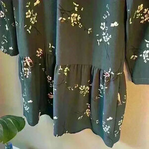 This dark green long sleeve dress features a separate liner, as shown in photo, a single button closure on the back and a ruffled hem. The neck is puffy, see photos. It is pre-owned and in very good condition.