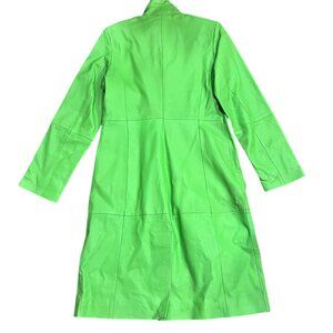 This lightweight long-line leather coat features a high neck, double zip and snap front closure, hand pockets, and a back slit. New with tags, excellent condition. Lime green color, size medium