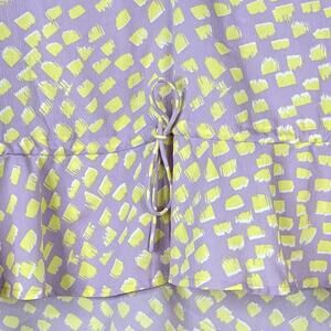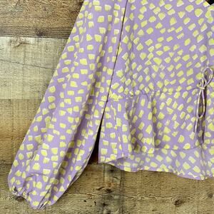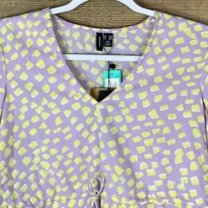 Vero Moda Lyla V-neck Top. Size medium petite. Color ~ Purple with yellow pattern. Long sleeve. Drawstring waist. Elastic cuffs. New with tags. Measurements are in the pictures.