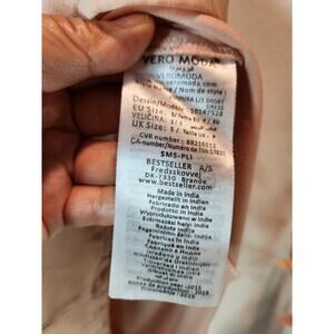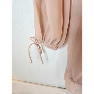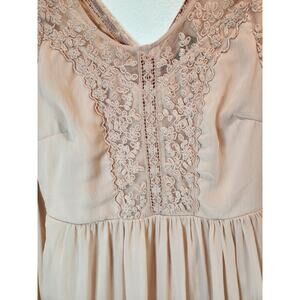 This Vero Moda Modura dress in size S features a soft beige tone with delicate lace detailing, a flowy silhouette, and semi-sheer long sleeves with tie cuffs. The deep V-neckline and gathered waist add a flattering shape, perfect for a boho-chic look. Lightweight polyester fabric makes it great for layering or warm-weather wear. Measurements: Pit to Pit: 19”, Length: 34”.