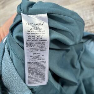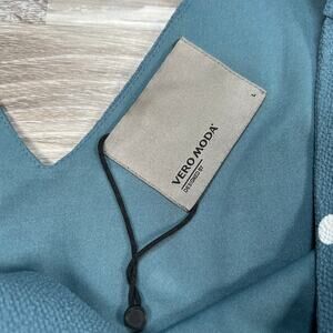 Vero Moda sleeveless dress with a V-neckline and allover white polka dot print on a rich teal background. Lightweight crepe-style texture with a clean, minimalist silhouette. Size Large. Perfect for spring and summer styling—wear solo or layered under a denim jacket.