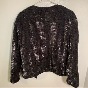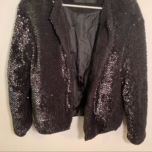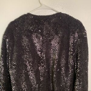 Great condition. Vero Moda. Starlight Jacket. Black. Alternating fuzzy fabric and matte sequins. Very sparkly! Elastic bottom and sleeves. Pockets. Front Hook Closure. Fully Lined. Style 10186144. Size Small. 100% polyester. Pit to pit laying flat 23” Shoulder to hem 20.5” Sleeve (pit to hem) 19.5”. All measurements are approximate and taken lying flat. Smoke free home. No trades, offers welcome.