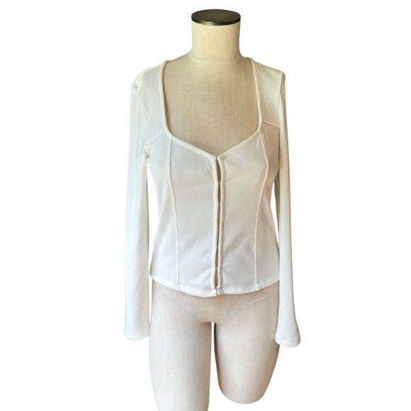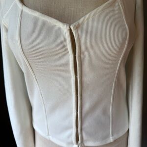 This is a Vero Moda ribbed knit cardigan with hook and eye closures. It is stretchy and form fitting with long sleeves and a sweetheart neckline.