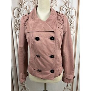 A chic blush pink trench coat, designed with a sophisticated double-breasted silhouette and stylish ruched detailing on the sleeves. This jacket features a unique button arrangement, including decorative buttons on the shoulders, adding a touch of elegance. The classic collar can be worn open or buttoned up for a more structured look. Perfect for adding a layer of warmth and style on transitional days, dressing up a casual outfit, or completing a polished, professional ensemble.
