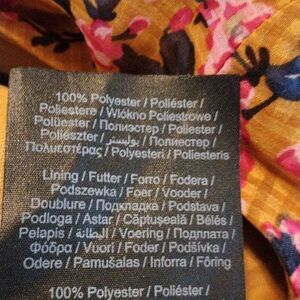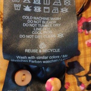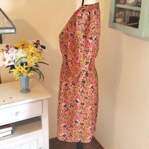 Fall colors in a lightweight semi sheer fabric over a full lining. Floral over a plaid background. V neck in front, keyhole in back. Med. length sleeves with covered buttons. Elastic shirring at side waist. Size XS measures 34 at chest, 26-34 at waist, 40 at hips (lining), 36 long from shoulder to hem. So pretty, I love theses colors.
