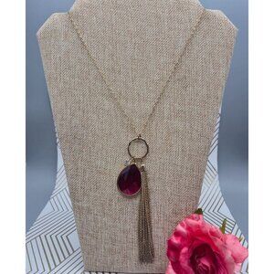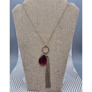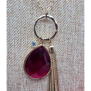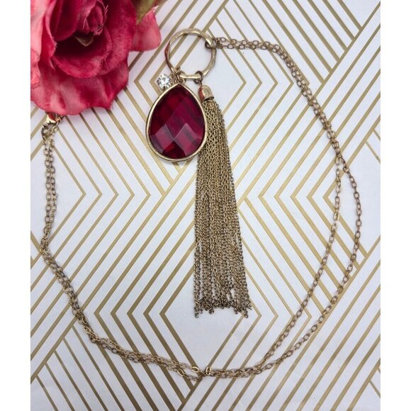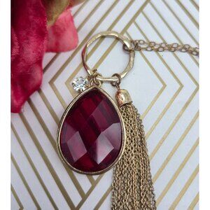Veronese Signed Gold Tone Tassel Red Teardrop & Crystal Pendant Necklace 32"
