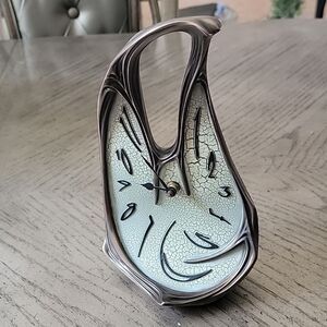 Made of cold cast resin, this awesome battery powered table or mantel clock is reminiscent of Salvador Dali`s famous painting, The Persistence Of Memory. The clock looks as though it has melted, yet still tells great time. The clock with a beautiful metallic bronze finish, an off-white crackle painted face, and black hands and markers. It runs on one AA battery. This clock makes a great gift for the surreal person in your life.