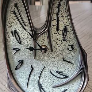 Made of cold cast resin, this awesome battery powered table or mantel clock is reminiscent of Salvador Dali`s famous painting, The Persistence Of Memory. The clock looks as though it has melted, yet still tells great time. The clock with a beautiful metallic bronze finish, an off-white crackle painted face, and black hands and markers. It runs on one AA battery. This clock makes a great gift for the surreal person in your life.