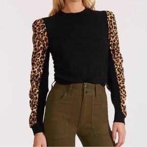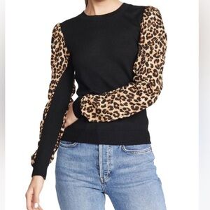 Veronica Beard 100% Merino Wool Leopard Print Sleeve Black Sweater Top