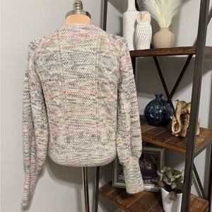 The Veronica Beard Adelaida Blouson-Sleeve Sweater in size Small features a solid multicolor design with a cable-knit pattern and gold button accents. Made from a wool blend material, this pullover sweater has a crew neck neckline, long blouson sleeves, and a regular fit. Suitable for travel or casual wear during the winter, fall, or spring seasons, this lightweight knit sweater exudes a stylish and trendy aesthetic with a touch of metallic theme. Perfect for women looking for a cozy yet fashionable addition to their wardrobe.