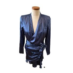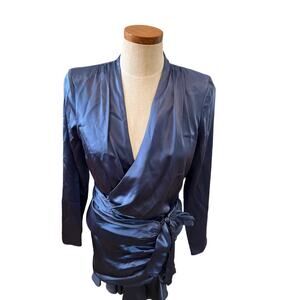 New Veronica Beard Agatha Silk Satin Wrap Ruffle Mini Dress in Steele Blue, size 4. Silk spandex blend, fully lined (polyester).