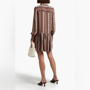 Victorian tapestry print Blouse style sleeves with dramatic elastic cuffs Button down front Drop waist with a babydoll flared skirt Missing the necktie though you can't tell that it came with one - see photos Also missing size tag - so please refer to measurements - this is supposed to be a looser fit than a lot of Veronica Beard dresses - I also own the full length version of this Size 4 20" pit to pit 36" long