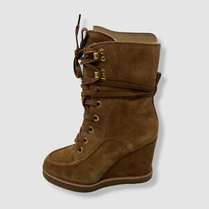 Veronica Beard's super comfy wedge booties in tan/brown, size 9.5. Lace-up with shearling lining, water-repellent.