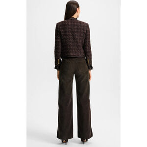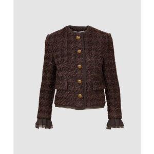 The classic lady jacket—with a high-shine twist. Crafted from maroon tweed with a metallic houndstooth pattern, the Audrina features a fitted, cropped silhouette and collarless neckline. A sheer trim and removable peekaboo ruffled cuffs add a touch of romance, while gold-ribbed buttons add a statement finish. Pair with corduroy jeans for everyday ease or a maxi skirt for a more polished look.