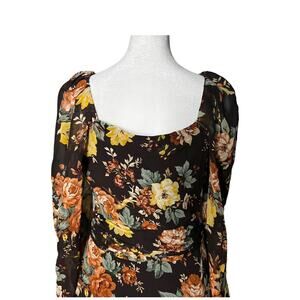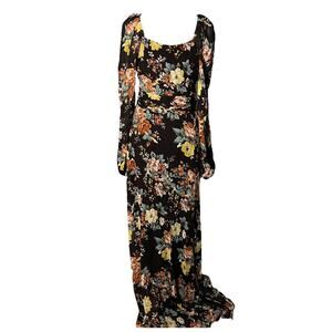 Features: allover floral print, pleated cross v neck, puff sleeves, high slit, maxi length,