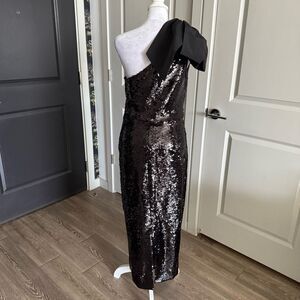 This dress gives an old Hollywood vibe, perfect for a black tie wedding guest and other formal events! By Veronica Beard, the Bader dress features allover black sequins beading with lining for comfort, one shoulder neckline, slim fit throughout with a good amount of stretch, back slit at hem, side zipper closure and midi length. Dress comes with an exaggerated bow detail which elevates the look even further! Great condition, wore once, such en elegant and special dress!
