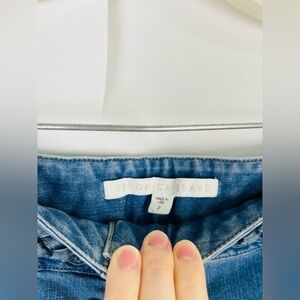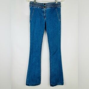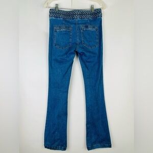 Stunning slimming boot cut jeans with braided waist detail. One small distressed section (see photo). Unsure whether intentional. Size 2. Waist about 14.5 inches laying flat. About 9 inch rise and 31 inch inseam. Plenty of stretch. Excellent condition.