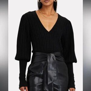 Veronica Beard Black 100% Merino Wool Esme V Neck Puff Sleeve Sweater Medium