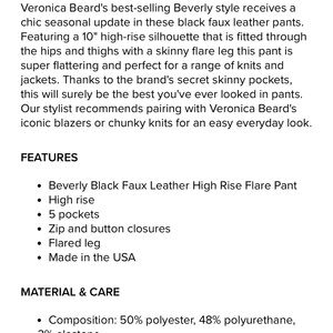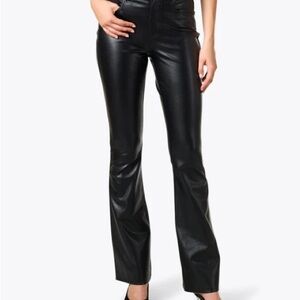 These Veronica Beard pants feature a sleek black leather construction with a sophisticated boot-cut flare. The high-waisted design and smooth, glossy finish make them perfect for both casual and dressier occasions.