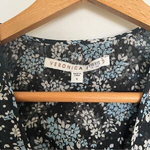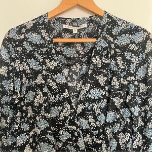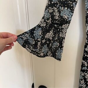 Black floral printed silk (100% Silk). Sheath. Long sleeves. V-neckline. Hidden side zipper closure.