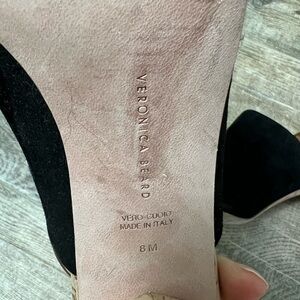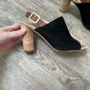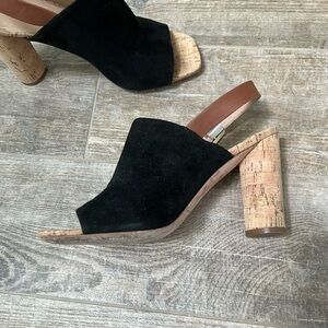 Step out in style with these Veronica Beard heels, featuring a sophisticated black upper and a contrasting brown cork heel. The open toe design adds a touch of elegance, while the substantial heel provides both height and comfort. Perfect for elevating any outfit, these heels are a versatile addition to your wardrobe.