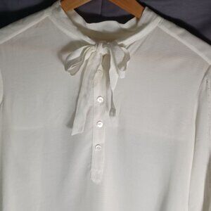 Elegant blouse featuring a stylish bow tie neck and button front. Ideal for office wear or formal occasions.