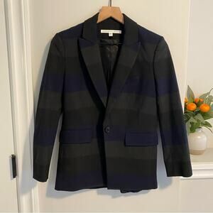 I am so in love with this stunning, rare designer Veronica Beard charcoal gray/blue horizontal stripe/color block one button dickey blazer jacket featuring notched lapels and front pocket details