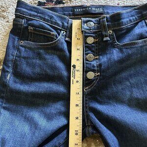 These stylish Veronica Beard jeans feature a high-rise fit with a cropped length. They are made of durable and comfortable denim fabric, with a dark wash that gives them a sleek and modern look. The jeans have a 5-pocket design and button closure, with accents such as a zipper and logo detailing.