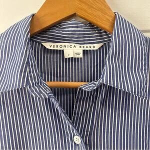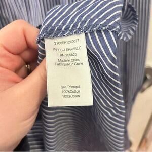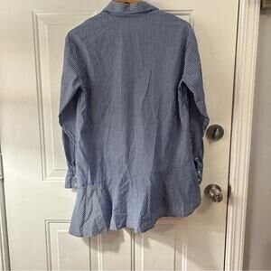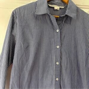 Stylish blue striped blouse. Features button-down front. Long sleeves with a relaxed fit. Perfect for casual or formal wear.